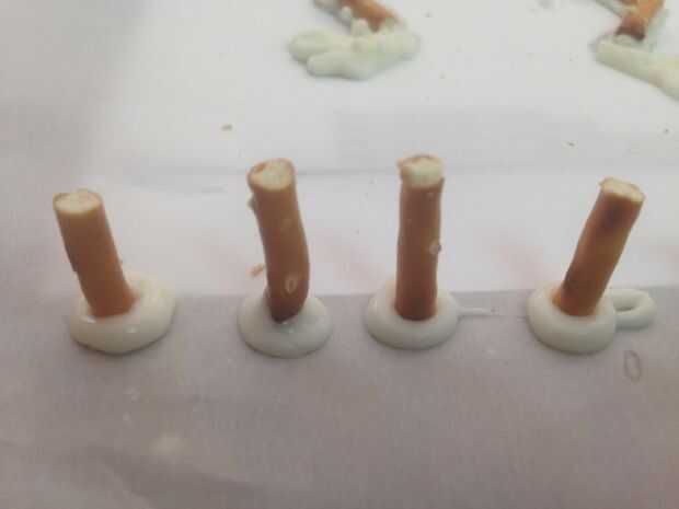 Utilizando algunos de los cuartos de pretzel, stand recta en los puntos de chocolate.