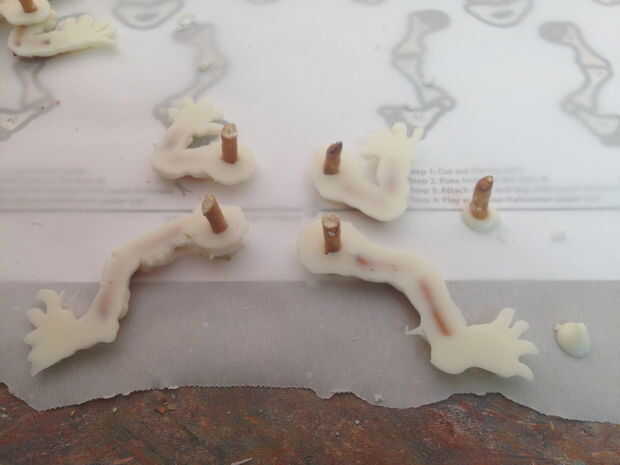 Finalmente, para completar el esqueleto, la tapa de los clavitos por pipping una cantidad tamaño de chip en el extremo de lo pretzel.