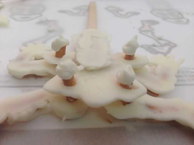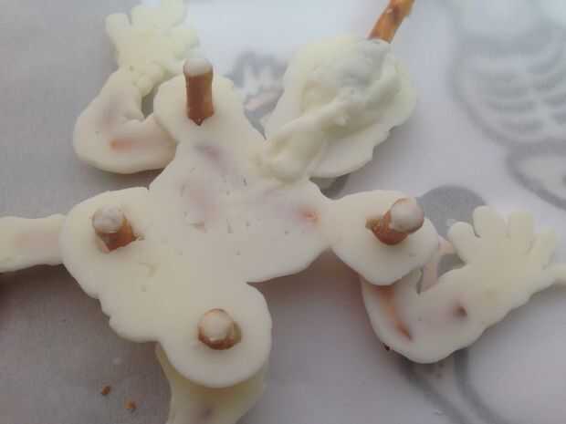 * Nota: Al colocar el palillo en la parte trasera Asegúrese de que va a lo largo del cuello del esqueleto para propósitos de refuerzo. Si tu palo de pretzel es demasiado corto solo añadir más chocolate en el cuello para el refuerzo entonces añadir el palillo más hacia la parte superior.