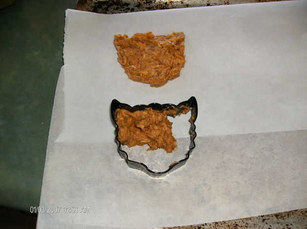 Forrado una placa para horno con papel sulfurizado para asegurarse de que no pegan las golosinas. Esta masa no levantan o repartidos para que puedas hacer algunas formas lindos. La masa es muy pegajosa y un dolor a trabajar aunque lo mejor sería desplegado con harina pero decidí evitar eso porque me estoy empezando a da la sensación de que este pequeñín tiene una alergia al trigo leve. En cambio yo solo coloca cortadores de la galleta en la bandeja y extender aunque masa dentro luego despegó el cortador. Hice unas formas y con el resto de él acaba de hacer poca mordida tamaño piezas. Hice mis galletas muy finas, sólo tomó unos 10 minutos para cocinar. Podría hacerlos más gruesos y tienen golosinas masticables o delgadas y cocinarlas un poco más de una crisis.
