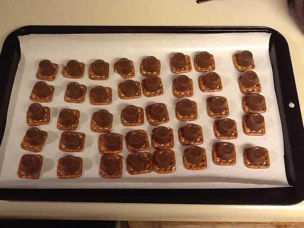 Luego coloque un Rolo en la parte superior cada pretzel.