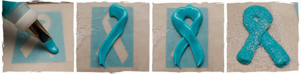 favorito royal icing, utilizar gel colorante para que sea el teal color correcto (yo usé una combinación de Teal de Wilton y Americolor azul eléctrico) e imprimir su imagen prediseñada para seguimiento. Utilice el lado liso de una punta de la tubería de armadura de cesta para trazar su forma de cinta en papel encerado y espolvorear con azúcar que enarena mientras la guinda está aún húmeda. Una vez que el glaseado haya secado por completo, sus transferencias de cinta de sobreviviente de cáncer de ovario pueden utilizarse para decorar los dulces de tu elección. (Para más detalles sobre cómo crear transferencias de glaseado real, ver