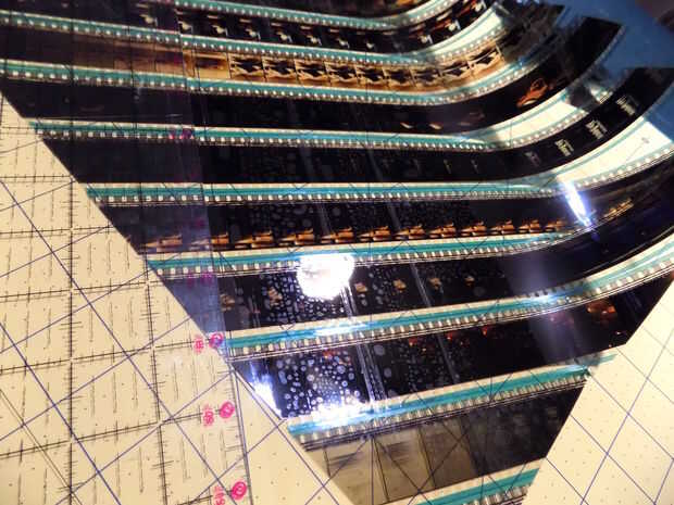 Utilice la regla de la quilter presionado los bordes rizados y poner tiras de cinta de arriba a abajo toda la parte posterior de la película.