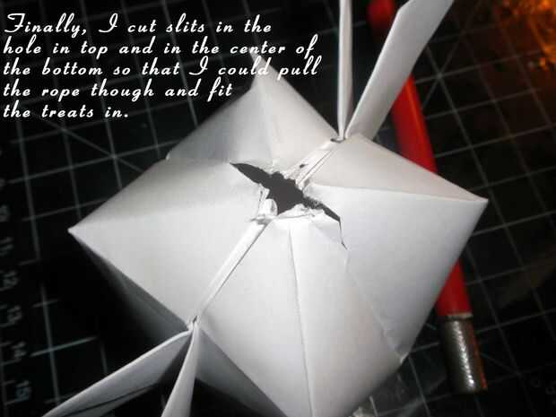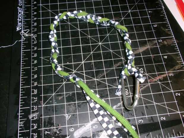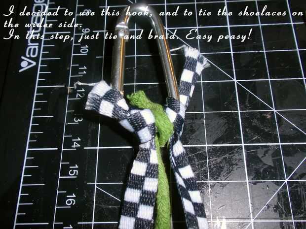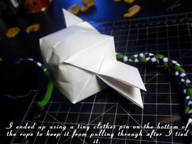 La cuerda era difícil tirar a través, y había hecho el agujero en el rip de la parte inferior un poco, así que añadido un pin de ropa pequeña en el extremo de la cuerda, después de había anuda.