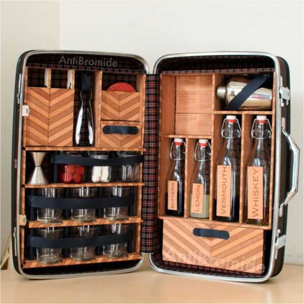 Travel Bar dentro de una maleta de forma que siempre exactamente lo que necesita para hacer bebidas más complicados en cualquier parte. Mi caso está diseñado para 3 diferentes whisky basado en bebidas y tiene suficientes vasos y posavasos para 6 personas.