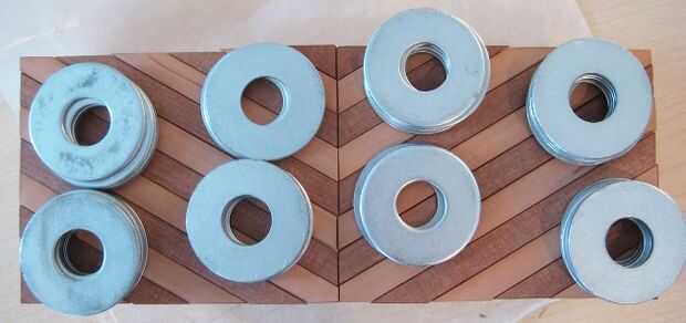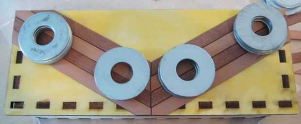 Aplique una capa delgada consistente de pegamento para madera en la superficie a que son pegado. Coloque con cuidado la pieza de chapa de madera. Usé pilas de arandelas para mantener la chapa plana y en su lugar como he añadido piezas de chapa.