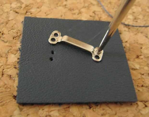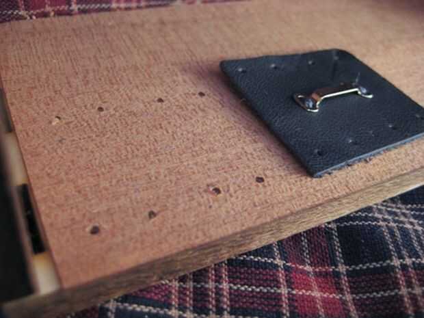 Los orificios en la parte del asa de metal están muy juntas, demasiado cerca para perforar los agujeros en la madera. Me Ate el pedazo de asa de metal a un cuadrado de cuero y luego fije el cuero a la madera. Taladre los agujeros en la madera que coincidan con los agujeros perforados en el cuero y coser el cuero a la madera.