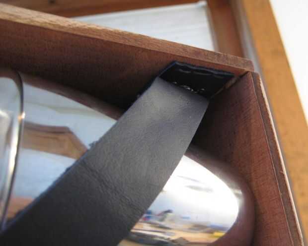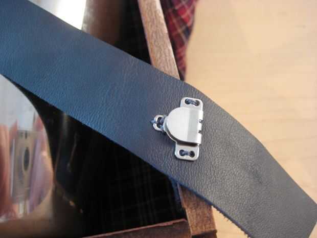 Crear cinta de tela suficientemente largo para conectarlo a la caja de madera y gancho para el bucle. En un extremo de la correa del gancho un metal con la consideración al ángulo, lado de la piel y posicionamiento global de la correa. Coloque la correa en el caso.