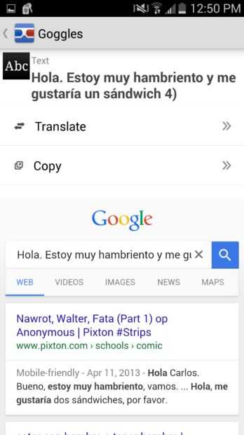 5) gafas Google es una aplicación útil/interesante que le da información acerca de cosas que fotografiar. Normalmente reconocerá muchos monumentos y lugares famosos, productos, logos y más y le permitirá realizar una búsqueda en google utilizando esa información de la imagen. También le permitirá tomar un cuadro de texto en una lengua extranjera y traducirlo!