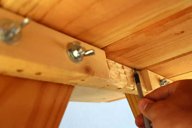 Coloque el tablón del centro en la tabla superior en su posición original. Marcar en la parte inferior de la tabla donde la Cala se encuentra con la Junta de centro; a compensar esta marca por alrededor de una pulgada para permitir que la Junta de centro en la Cala. Repita este paso en el otro extremo del tablero.