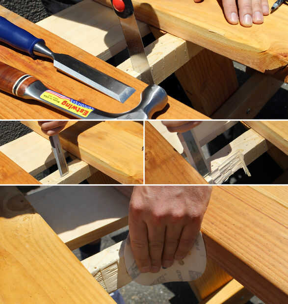 A continuación medí desde el final de las jardineras hasta el final de la tabla, esta longitud será picada de cualquiera de los extremos de la duela del centro. Los extremos cortados luego ser reatados.