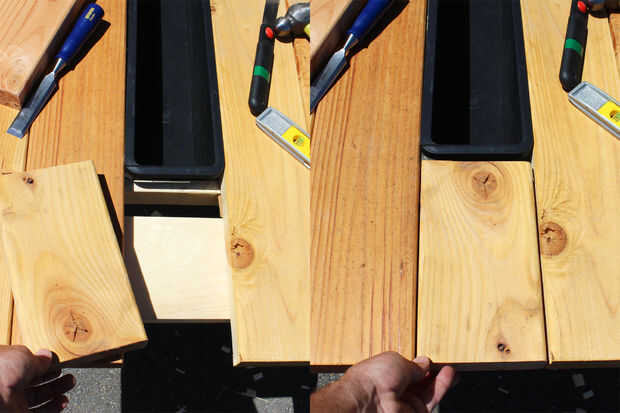 Con la dimensión del canal medido en el tablón del centro que nos podemos cortar los extremos. Con una sierra los extremos fueron cortados limpiamente desde el tablón del centro.