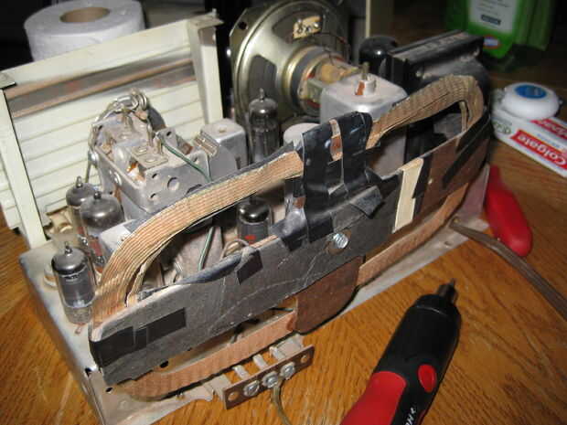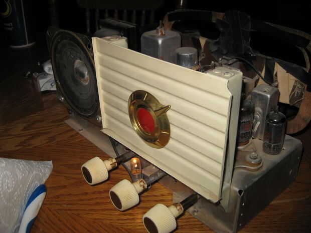 quité el chasis que se celebró en por debajo de 4 tornillos y también las perillas en el frente que pop apagado con un destornillador. parece que han sido algunos actualización hecho al chasis un tiempo en el pasado también. tiene un cable de alimentación polarizado, un altavoz buscando nueva y ajuste cadena dial que estas cosas que sé no originales a la radio. IM no está seguro si los tubos son originales o no, se ven realmente limpia y luz bien. el chasis no tiene se oxidan o para el caso de polvo en cualquier parte de él. la parte inferior es toda original tapas resistentes a y tela cableado. la antena en la parte posterior funciona muy bien aún.