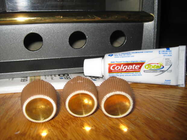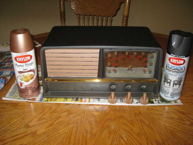 después de que terminé de pintar el resto de la radio, yo deje que se seque durante unas horas antes de que quiten la cinta y el papel. los resultados salieron bien, no funciona en la pintura o manchas que faltan piezas. el lente se quedó limpio y no sobre aerosol consiguió en ninguna otra parte de la radio. el siguiente paso fue pulir ese bronce en la cara y el frente de las perillas. sólo usé alguna pasta de dientes para hacer esto, no seca a la pintura como pulimento o cera y su prueba de maniquí. un poco en papel higiénico frotando uniformemente en el metal va a hacer muy bien. después me froté sobre sólo limpiarlo con un pedazo húmedo de papel higiénico y brilló para arriba como lo fue spankin nuevo!