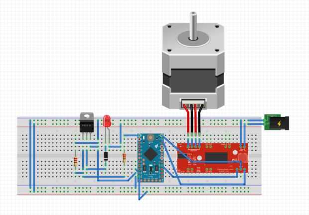 Luego soldar los circuitos del motor y calefacción elemento junto con el Arduino Mini Pro, que funcionan con la misma fuente de alimentación (12V/1A). El circuito parecía algo como esto (el elemento de calefacción es que el LED rojo).