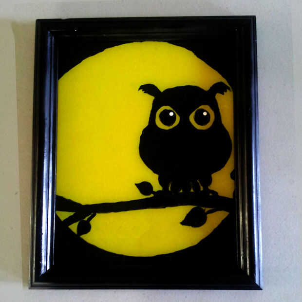 Hice esto para la habitación de mi hija, le encantan los buhos. Pensé que sería divertido tener la luna y los ojos brillan en la oscuridad. Ella lo ama. Ahora tengo que hacer fotos de pájaros enojados para mis 2 hijos. Lol.