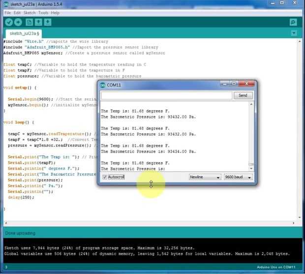 Ahora ejecute el programa y compruebe el serial monitor y usted debería ver mediciones de temperatura y presión.
