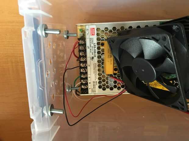 1. Conecte los cables rojo y negro del ventilador al V + y V-ports en la alimentación.