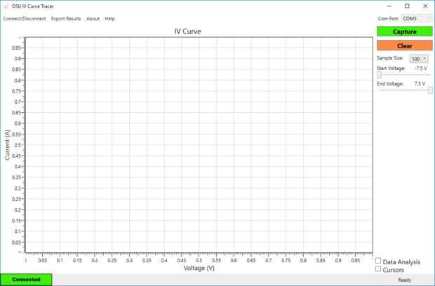 Abra el menú de conectar/desconectar en la parte superior izquierda de la interfaz y haga clic en conectar. El botón de captura serán visible y el software está listo para trazar una curva.