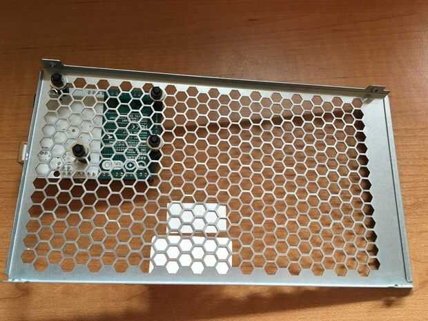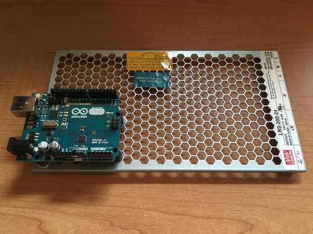 Usando un destornillador de cabeza philips, retire la cubierta superior del panal de la fuente de alimentación. Montaje de 4 de los espaciadores de PCB de M3 en el panal usando arandelas M4 para evitar que las tuercas de espaciador de nylon deslizándose a través del panal. Utilizar otro conjunto de separadores para asegurar el Arduino a la cubierta de suministro de energía. Tenga cuidado para el Arduino es no ponerse en contacto con la cubierta de metal ya que puede causar un corto circuito.