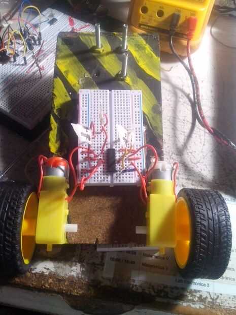 Como puede ver en la fotografía podemos ver el puente H y los motores ensamblados a una base y parásitos para operar