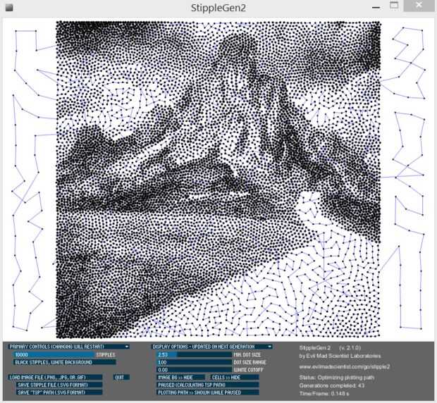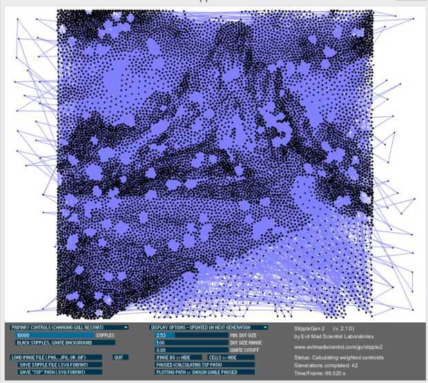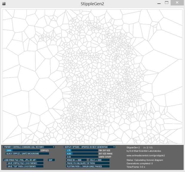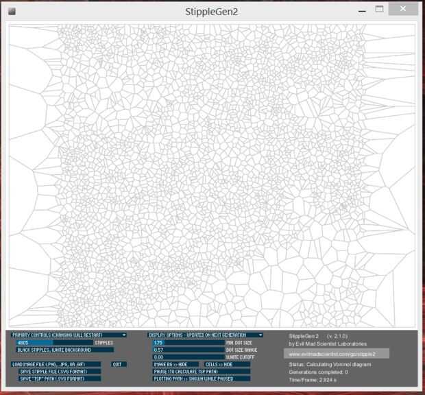 Para el real el punteado de la imagen, utilizaremos una pieza de software de Evil Mad Scientist, StippleGen2, avalible para la descarga de http://www.evilmadscientist.com/2012/stipplegen2/.