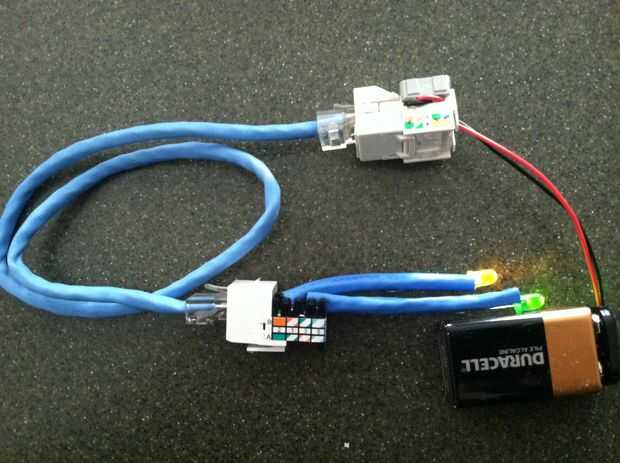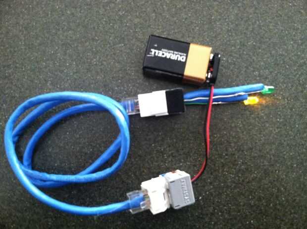 Conecte la pared con una batería de 9 voltios y un extremo de un cable de red. Conecte el otro extremo del cable de red al puerto de pared con el LED. Si iluminan ambos LED está conectado correctamente, si sólo una luz indica cual par es incorrecto.