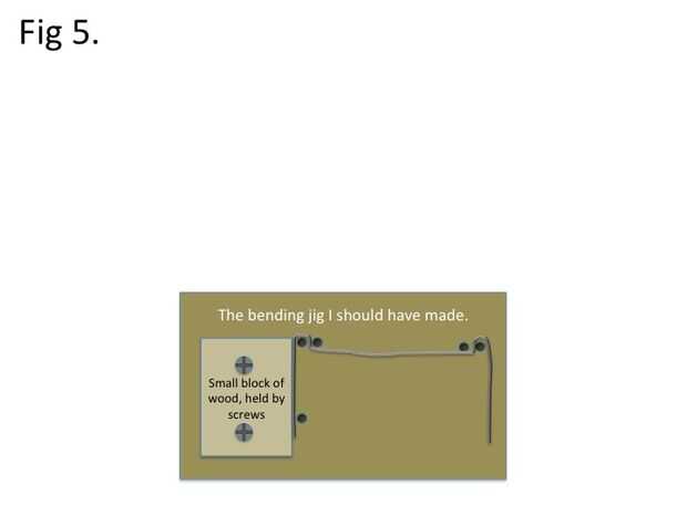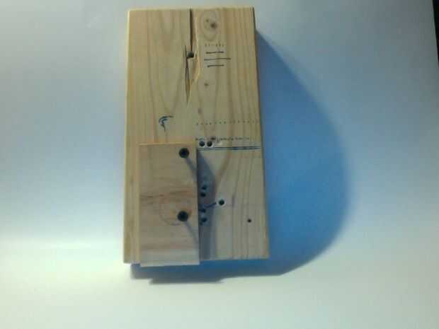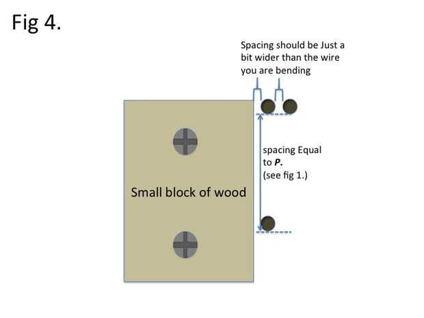La plantilla de doblez se hace de un pequeño bloque de madera atornillada a un bloque más grande de madera. Agujeros de 3/16 de pulgada están perforados en el bloque y barras insertadas en los agujeros más grandes. He usado brocas como las clavijas porque encajan exactamente en el agujero que crean, pero cualquier varilla, perno o tornillo 3/16" probablemente trabajaría. Clavijas de madera son probablemente demasiado frágiles, pero eres Bienvenido a probar. Si funciona, deja un comentario.