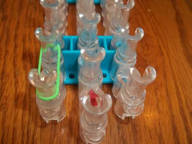 Pone una banda de goma verticalmente en la primera clavija a la derecha. Asegúrese de que están empezando en el lado donde apunta la flecha roja lejos de usted.