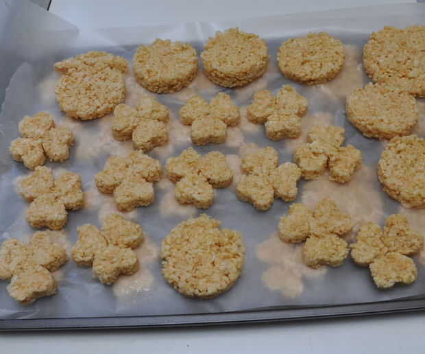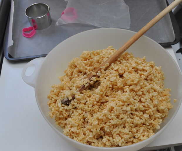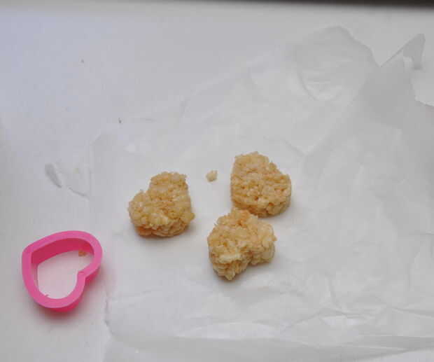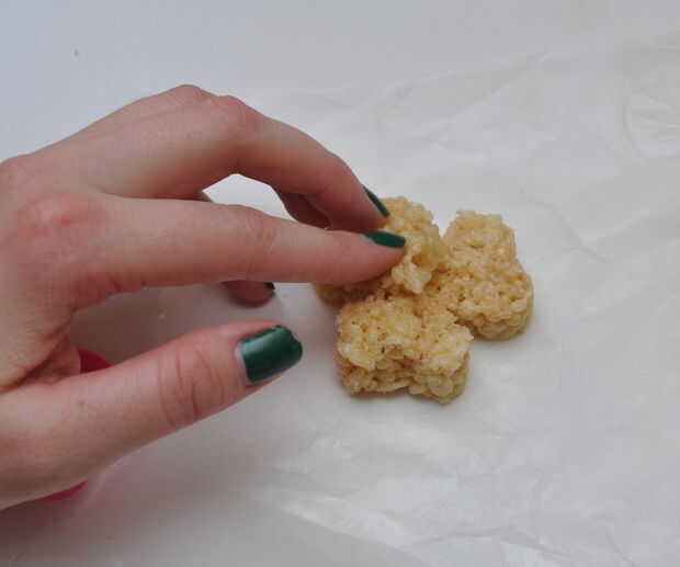 Mezcla de Krispies arroz Smash en el cortador de la galleta. Para hacer que los tréboles de corazones, hacer tres corazones primero. Juntar las puntas. Usted puede apenas clase de ensuciarse que ellos o usted puede Agregar un poco más rice Krispies en la parte superior donde se unen las tres puntas. No sean super resistentes, pero se endurecen y el fondant le ayudará a mantener todo junto.