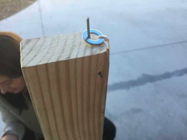 5) atar el otro extremo de la eslinga (no el uno con la lavadora) al segundo clavo