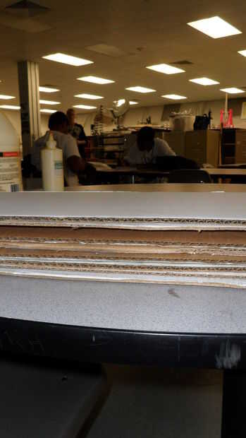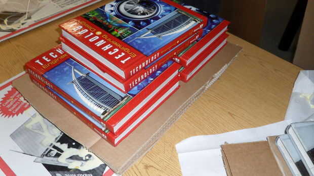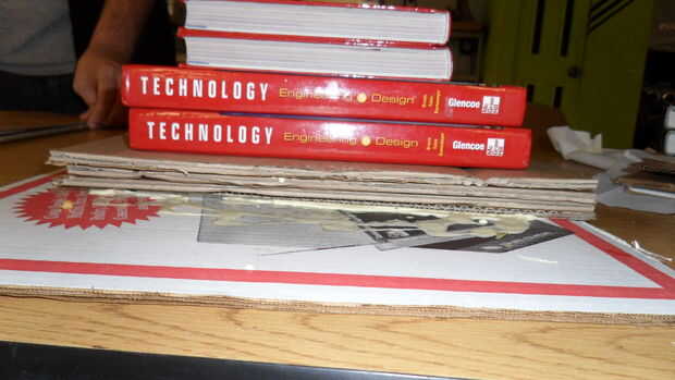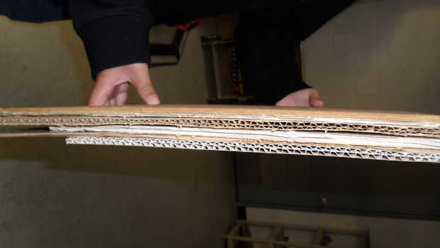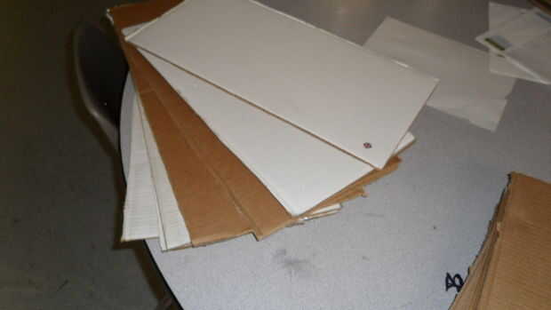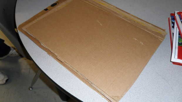 Laminado cartón cortando los tamaños especificados y capas con pegamento para madera para crear cartón siguiente stock los tamaños mencionados. Es aconsejable que pongas algún tipo de peso en la parte superior de la cartulina para evitar que se deforme o inclinación. Utilizamos libros de texto antiguos.Acción 1 (cantidad 1): 12 x 22 x 0,5 pulgadas (30 x 56 x 1,3 cm) Acción 2 (cantidad 1): 22 x 6 x 7/8 pulgadas (56 x 15 x 2 cm) acción 3 (cantidad 1): 11 x 15 x 2 pulgadas (28 x 38 x 5 cm) Acción 4 (cantidad 2): 17 x 12 x 1,25 pulgadas (43 x 30 x 3 cm)