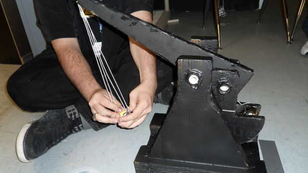-Para el brazo, llamaremos al final más fino la parte superior y el extremo más ancho de la parte inferior. Pegue el tubo largo de PVC de 1 - 1/4 pulgada en el orificio más cercano a la parte inferior. Pegue el tubo largo de PVC de 3 pulgadas en el agujero restante. Asegúrese de que estén centradas en el agujero.