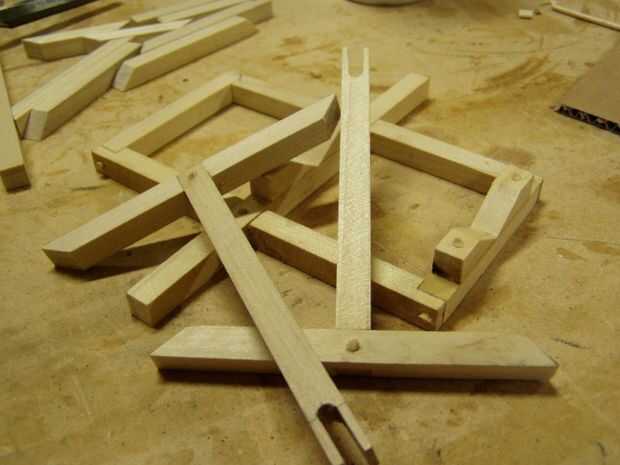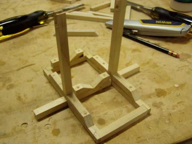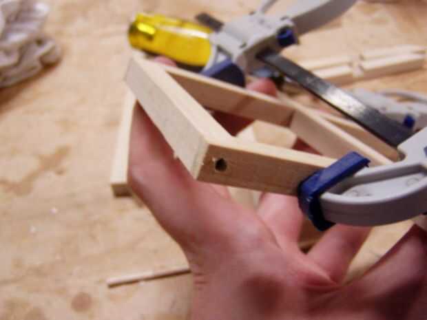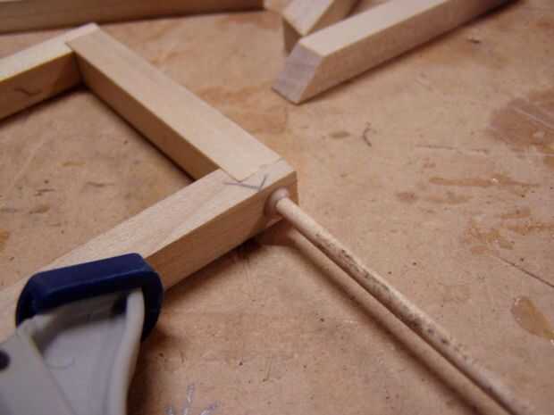 Es posible que pueda salirse con sólo pegar todas las piezas juntas pero cubrió todo con espiga de cola y Álamo; no es probable que alguna vez vienen aparte y se añade un elemento visual agradable. La parte inferior del marco de la abrazadera juntos y perforar donde quiera que se superponen. Haz un poco de pegamento en las superficies de Unión y luego poner un poco en el extremo de la espiga. y trabajar en su agujero y cortar o romper el pasador. Una vez que firmas hasta un poco puede afeitarse el quid restos apagado con su cuchillo o arena. Supongo que si estás muy aburrido, podría precortadas un montón de pequeñas longitudes de 3/8" y 3/4" de espiga y puntee en. Entonces no necesita regresar y les cortó.