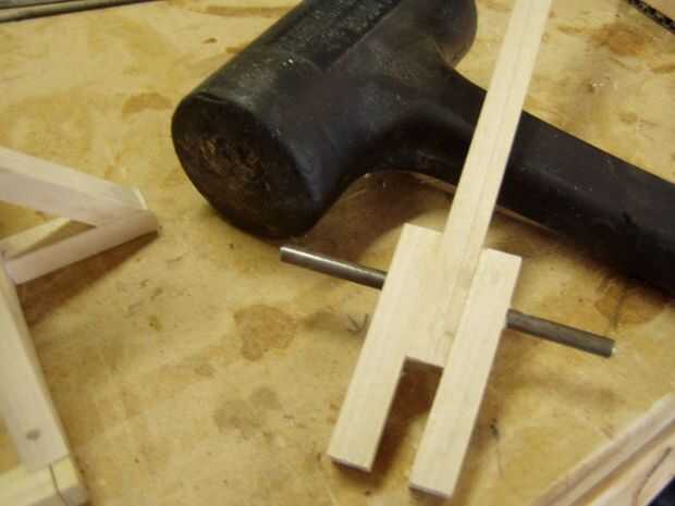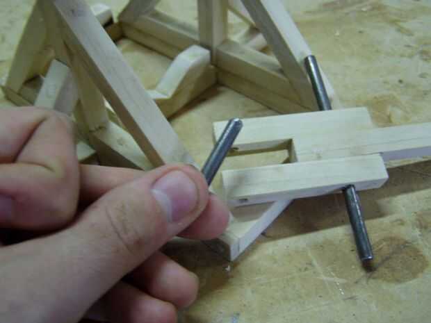 Los ejes principales se hacen de 3/16" varilla de acero. Si desea, puede utilizar aluminio. Va a ser más fácil de cortar pero generalmente cuesta más. Supongo que usted podría incluso utilizar un pasador de madera pero obtendrá un poco más de fricción. Compruebe la distancia entre sus postes y cortar una longitud apropiada de la barra para servir como su principal axel. Toque a través del agujero en su brazo de lanzar. Cortar otra pieza corta para ir entre los brazos para apoyar su contrapeso.