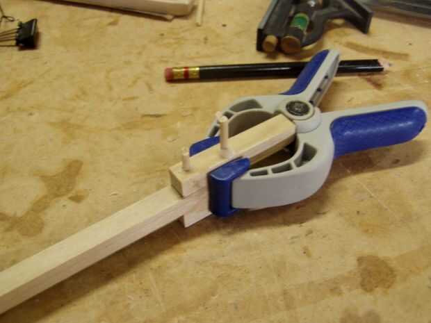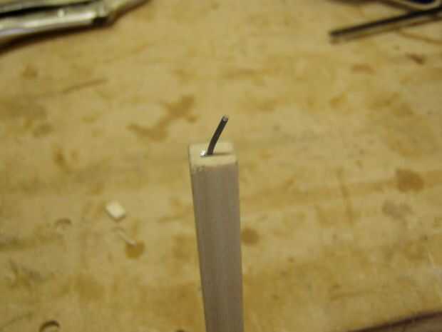 Entonces es hora de agregar el pasador de liberanción. Este es el fin del negocio de la trebuchet y es importante montar el pasador de forma segura. Usé una pequeña longitud de alambre de un clip para papel jumbo como mi pin. El orificio de 1/16" originalmente perforé para acomodar mi pin resultado demasiado grande. Forzando un poco de un pequeño clip en el agujero junto con él para un ajuste apretado agradable. Usted puede conseguir lejos con un poco de alambre en el taladro del portaherramientas y tratando de conducir directamente en el extremo del brazo.