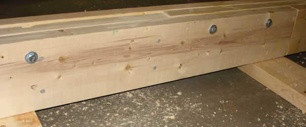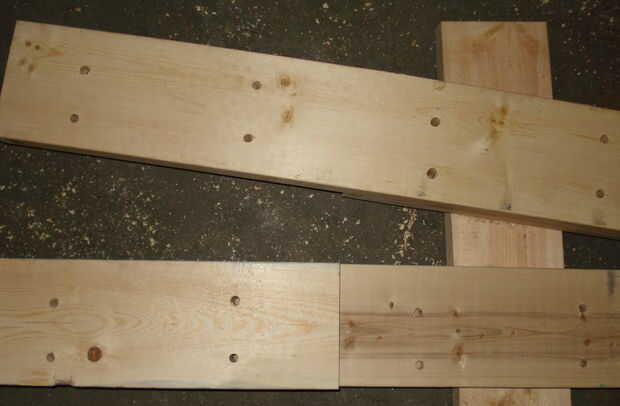 Si usted recuerda, el plan era conectar todas estas piezas base (como el resto de la trebuchet) con pernos. Elegí algo arbitrariamente los pernos de 5/16" de diámetro. Son 5 1/2" que era la longitud mínima para sujetar 2 x tres 6 cara a cara a cara. Arandelas y tuercas correspondientes al diámetro de 5/16" también fueron compradas. Inicialmente pensé en poner cuatro tornillos cada 16" traslapo (por un total de 8 tornillos por junta). En la retrospección que califica como excesivo--requeriría 32 sujetadores todo. Terminé comprando la mitad eso y dos extra (total 18), para dos pernos por conexión más repuestos. A perforación!