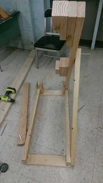 Desde la parte superior de (A), pegue el 9" 2 x 4 en (A). Entonces el 6,75" encima de los 9". Y finalmente el 4.5" encima de eso. Véase el cuadro 4 para la visualización. Lo mismo para el otro (A). En el punto medio de (A), pegar dos 9" encima de la otra y luego en el punto medio de (A). Asegúrese de que quede centrado. Centro de los dos últimos bloques de 4.5" sobre la parte superior de los bloques apilados de 9" y así el pegamento. Deje que estas seco correctamente antes de perforar en ellos.