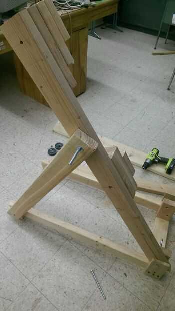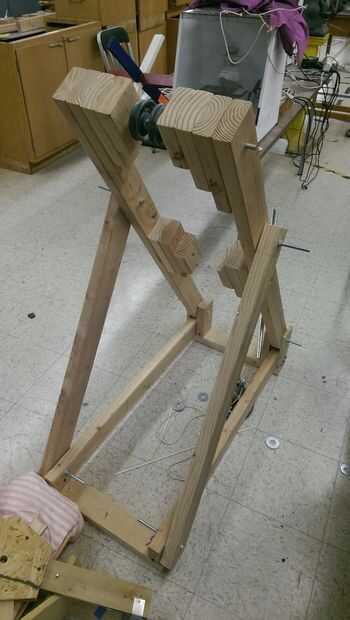 Ahora en el bastidor triangular. La longitud más larga de 2 x 4 será el principal "brazo" de la estructura. Estas dos longitudes particulares se inclinó hacia atrás sobre los brazos más cortos de la parte inferior y suspendidas con 7" piezas de madera a cada lado de la 4' largo 2 x 4. El marco sí mismo es un triángulo equilátero. Todos los del interior de las esquinas de la triángulo será 60°. Consulte las fotos de esclarecimiento. Las dos últimas tablas 3'3"(C) se apuntale en el tablón 4'(A), en el exterior de la tabla 3'3"(B) de fondo y la tabla 4'(A). (C) debe cumplir con (A) en la marca de 1' de la parte superior de (A). Puede perforar y poner los tornillos en donde reunirse, o pegamento y luego poner los tornillos en ellos. Pero antes de hacer esto, perfore los agujeros para los brazos y las poleas antes de hacer el marco permanente - que a menos que usted use pernos y puede separarlo fácilmente.