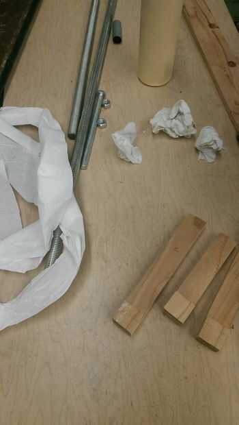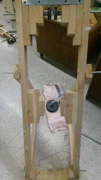 Para empezar con la base, pegue o atornille los tableros 3'3"(B) en los dos tableros de 1' 5,5" (D), con las piezas exactamente en los bordes laterales dispositivo de cada tabla (ver fotos). Fije las tablas 0.5" desde el borde corto de las juntas 1'5.5"(D). Esta es la base de la trebuchet.