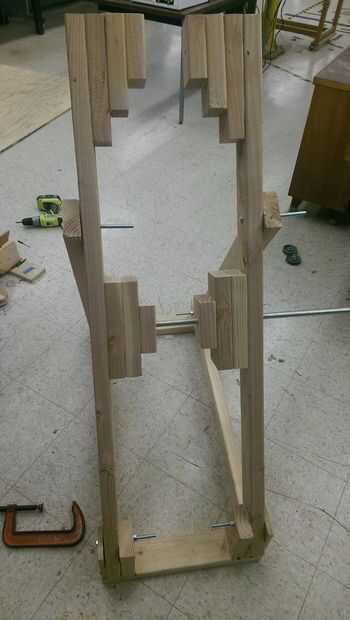 Finalmente, perforación de los orificios por donde van las varillas. A medio camino hacia abajo (A) donde las protuberancias de (A) para el brazo, perfore un orificio de centrado de 5/8" para cada brazo. En la parte superior de (A) donde están las protuberancias primeras, taladre un orificio centrado para una varilla de 3/8".