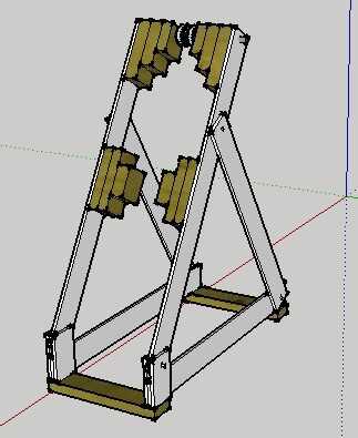 Una vez que has recopilado todos sus materiales, es la construcción de la parte siguiente el marco de. El trebuchet fue concebido con la ayuda de planos de Leonard Vance de su trebuchet MURLIN, aunque modificado y había cambiado la mitad de los aspectos de nuestras aplicaciones. Utilicé las medidas de sus planos, les redujo a la mitad y luego cambió todo lo que necesitaba. Entonces me puse a diseñar el trebuchet quería usando un programa CAD, el programa gratuito Google Sketchup, como se puede ver por encima. Me lancé entonces a construirlo.