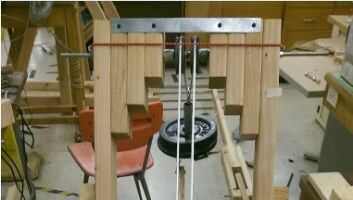 Inserte la varilla de 3/8" en el orificio superior para las poleas. En la foto, puedes ver que he utilizado un montón de arandelas como espaciadores de las poleas. Cuando usted inserte la varilla y llega al centro, puesto 16 las arandelas sobre ella, luego una polea, y luego 2 tuercas, otra polea y 16 más. Esto debe mantener las poleas rectos y evitar separarse aparte o conseguir demasiado juntos. Sujete ambos extremos del marco superior (A).