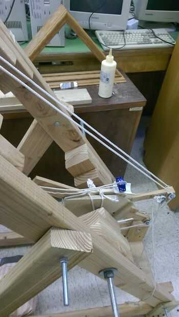 Y finalmente (de verdad), con la ayuda, los 2 extremos del CW sobre las poleas (de modo que la CW se tira hacia arriba), sobre las guías de lanzar el brazo y atarla con un nudo básico en el brazo principal (la parte más larga). Usando el lazo flojo, sobra cada lado debajo de la tubería metálica y sobre las planchas de madera contrachapada. Un nudo resistente (elijas lo que elijas) y corte el sobrante. Consulte la imagen 3 otra vez. Lenta y suavemente guía el brazo en una posición no armada, que debe ser el CW en el suelo en este punto.