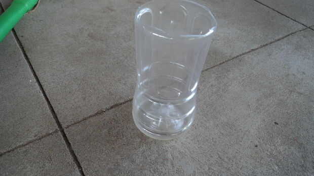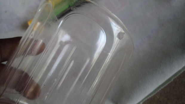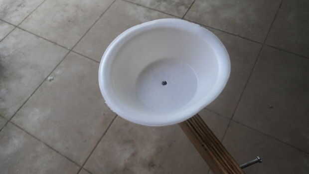 A un extremo del brazo (parte más larga), clavo el recipiente de plástico como se muestra en la imagen. Esto va a lanzar sus proyectiles. Martille un clavo en el otro extremo de la tabla. Esto mantendría la botella que estamos a punto de utilizar.