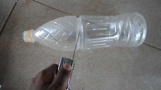 Cortar la botella de plástico en el medio. La mitad inferior es lo que necesita. Ahora arranco dos orificios diametralmente opuesto entre sí cerca del extremo superior. Pasar un hilo a través de ella y haga un nudo para que se puede llevar como un bolso. Rellenar con piedras y arena.