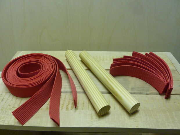 2. en segundo lugar poner el cilindro de madera lanzó la correa para ver hasta qué punto en ambos extremos que se debe coser para hacer un bucle ajustado que se ajuste bien alrededor de los cilindros de madera.