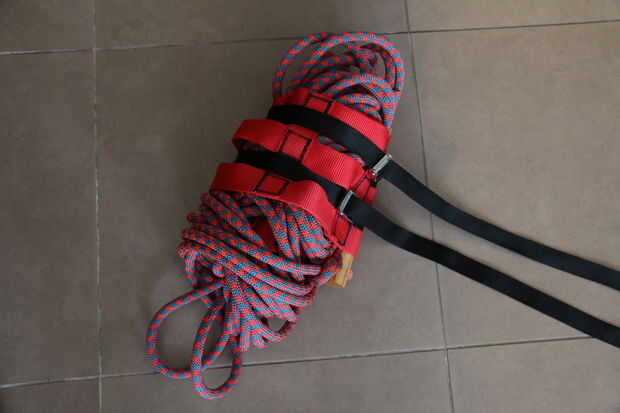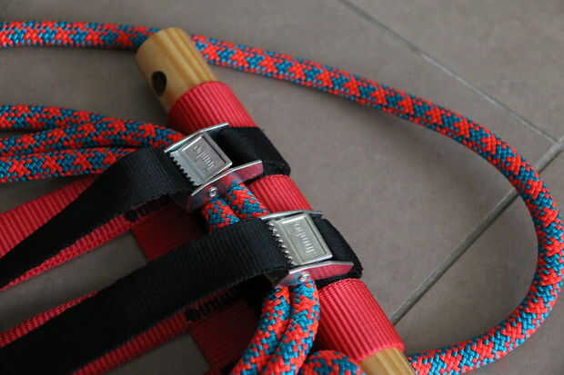 Ahora toma la hebilla y hacer un lazo alrededor del cilindro de madera y coser el lazo en el tamaño correcto. Hacer las correas de la hebilla lo suficientemente larga para sujetar los extremos sueltos de la cuerda de escalada bajo el asiento.