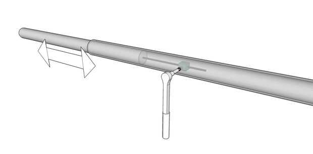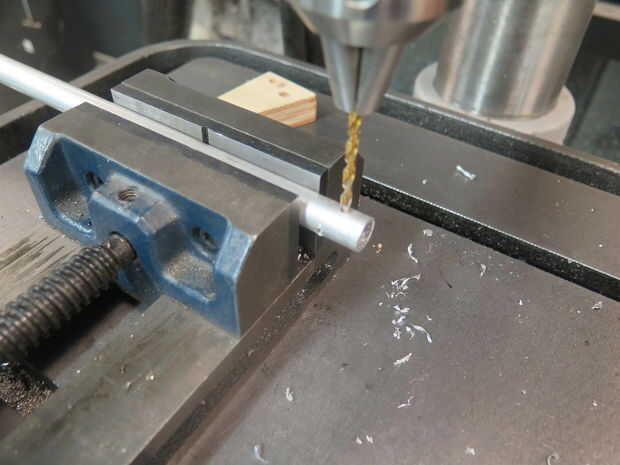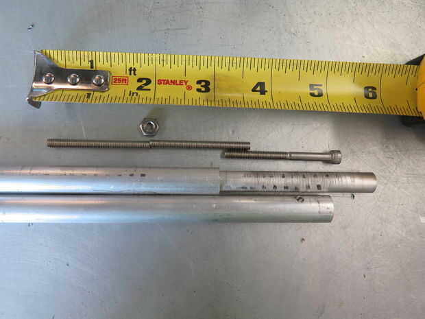 Pude encontrar un tubo de aluminio más pequeño que casi cabe el ID de mi material de puntal, sino no caber. Esta parte es necesaria para el mecanismo telescópico que traerá tensión en el sistema de tensegridad. Un pedazo largo de varilla roscada se convertirá a través de una tuerca colocada en el extremo de la costilla corta de aluminio telescópico. El extremo de la varilla roscada tendrá una presión de ajuste cojinete que se colocará en un punto medio en el puntal de longitud completa.