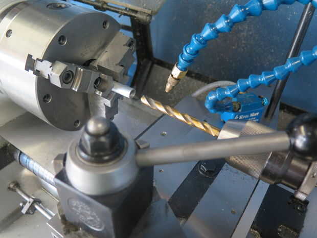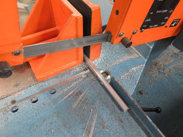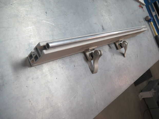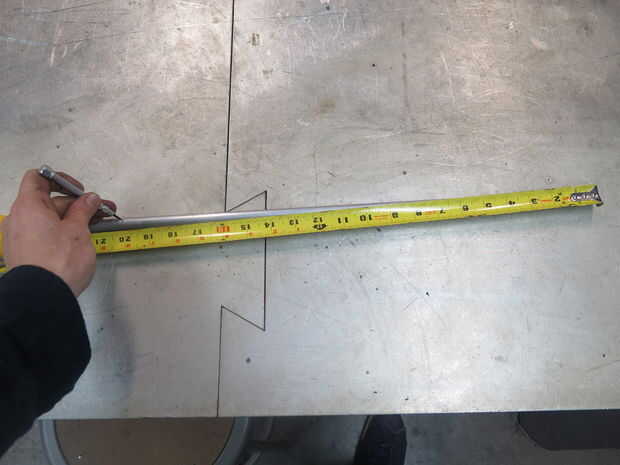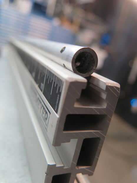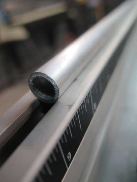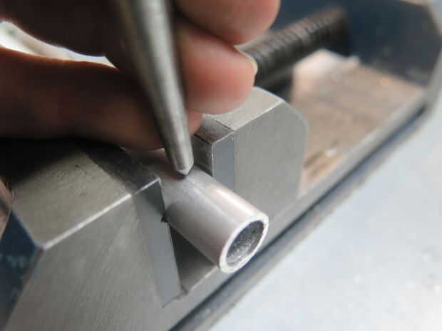 - Para el otro lado de la costilla en la marca para que los orificios están radialmente equivalentes necesita herramientas de abrazadera especial. No tengo la pinza centrado herramientas por lo que era capaz de improvisar con un borde dentado recto. Cualquier otro con precisión manufacturado objeto/dispositivo que contiene una ranura similar funcionará. Presionar el puntal en la muesca como a square al borde de la ranura en forma que el tubo quede plana en la ranura. Gire el tubo hasta que el orificio original se centra sobre el borde de la muesca. Siga el borde de la muesca al otro lado del tubo. Marque la ubicación con el escriba.